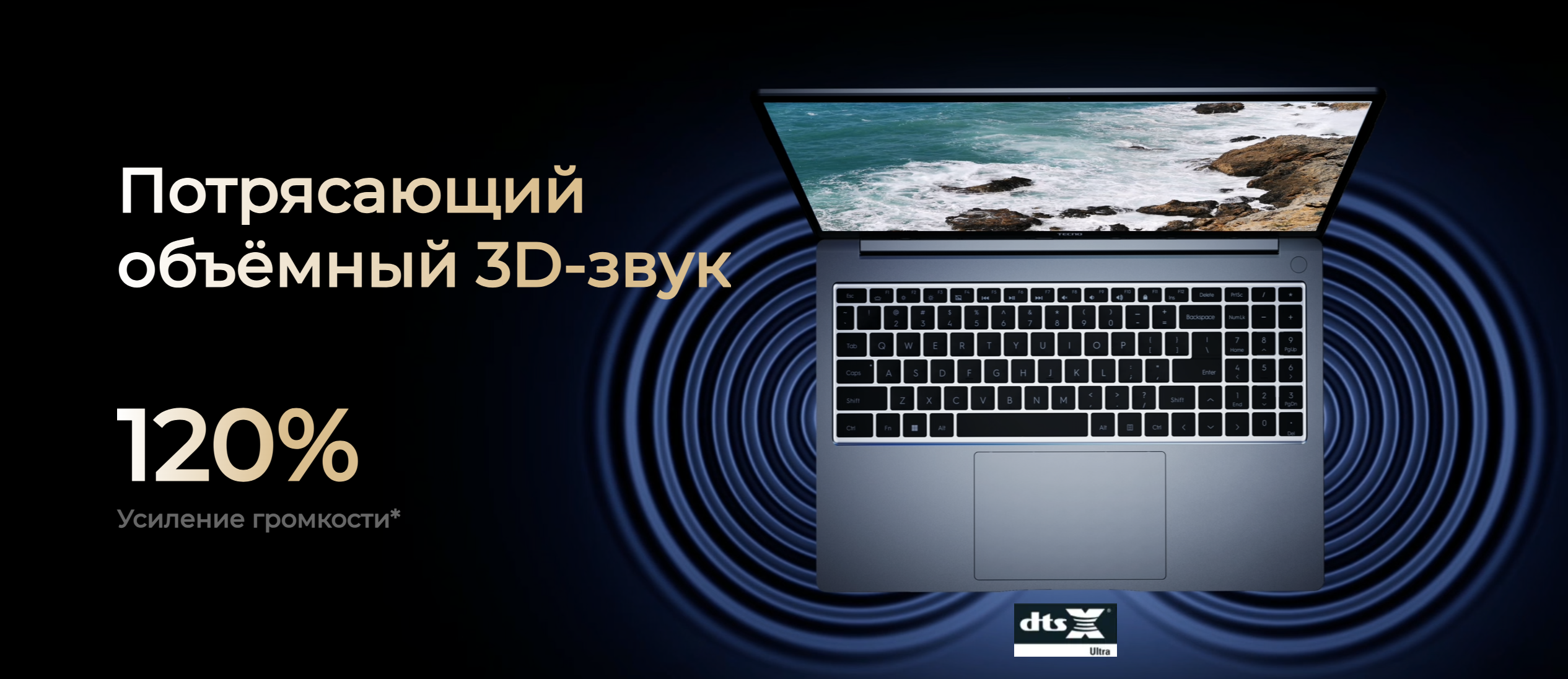 Встроенная аудиосистема ноутбука TECNO VOC с поддержкой объемного звука DTS X Ultra выдает глубокое насыщенное звучание.