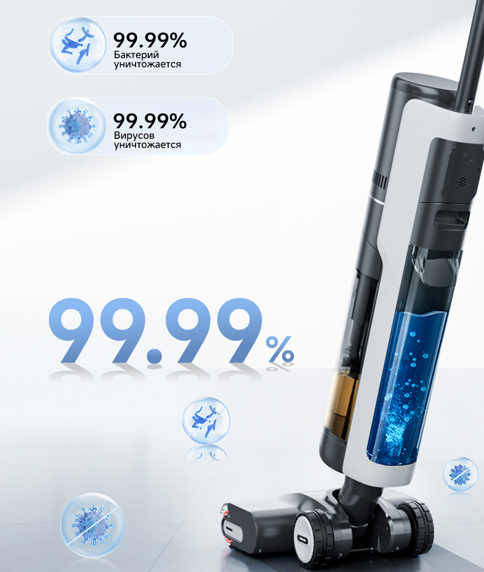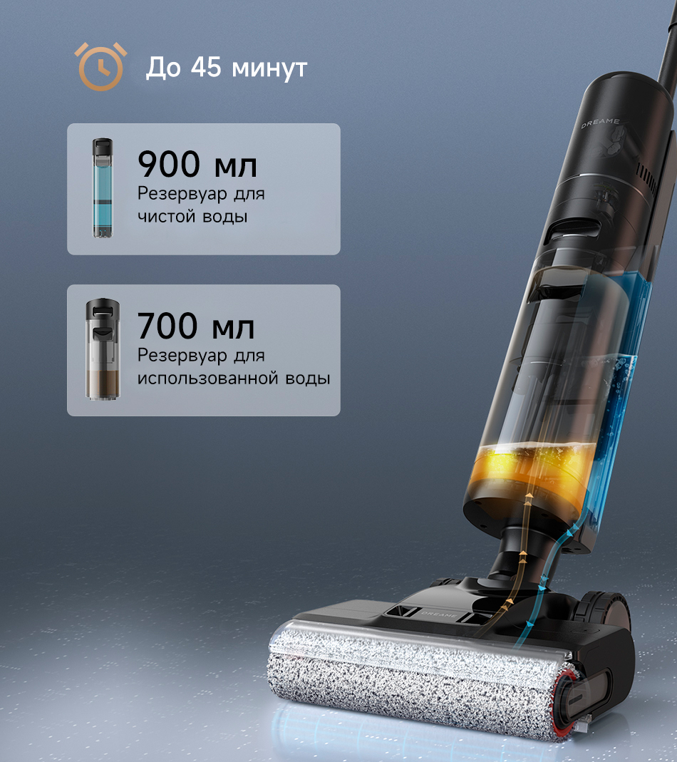 *Высокопроизводительный аккумулятор большой емкости (6 x 4900 мАч) освободит вас от беспокойства о низком заряде батареи. H13 Pro способен удалять как влажные, так и сухие загрязнения на протяжении 45 минут и на площади до 300 квадратных метров.