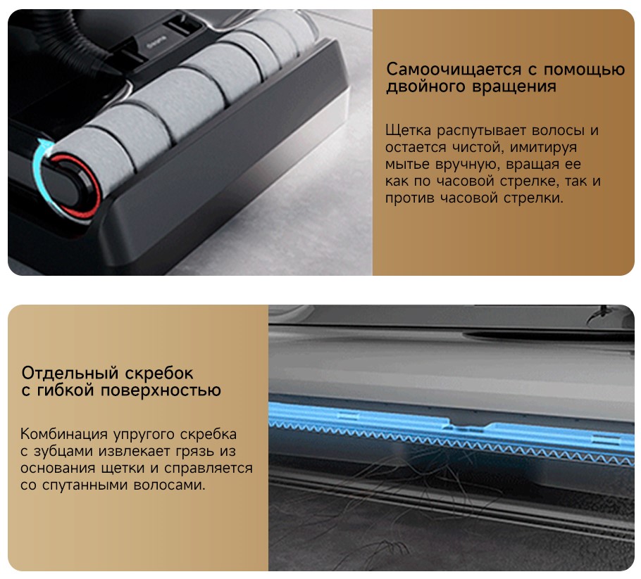 Самостоятельная очистка при помощи двустороннего вращения щетки и скребка с гибкой поверхностью.
