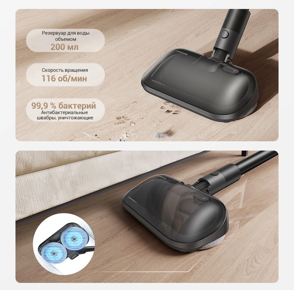 Эффективность уборки достигается благодаря высокоскоростному бесщеточному двигателю, обеспечивающему мощность всасывания 150 аэроватт (20000 Па) и надежное удаление волос, грязи, пыли и мелкого мусора.