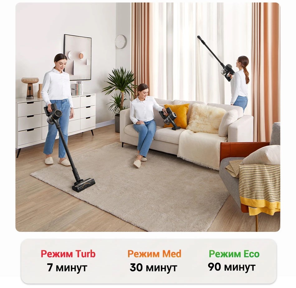 На светодиодном экране наглядно отображается уровень заряда аккумулятора и текущий режим уборки, что позволяет пользователю легко переключаться между режимами Eco, Med и Turbo одним нажатием кнопки.