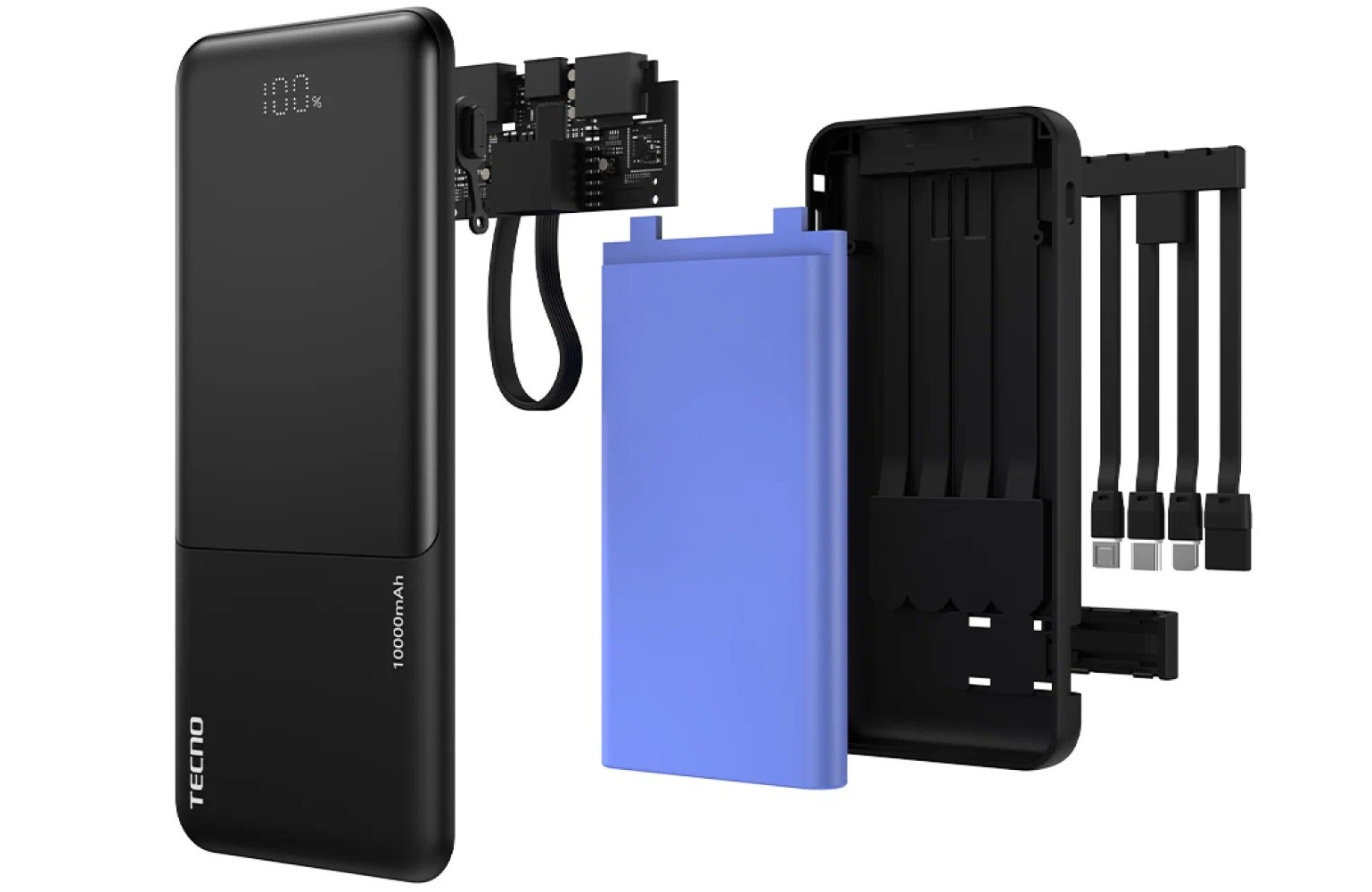 Tecno L101 предлагает высокий уровень универсальности благодаря наличию четырёх встроенных кабелей: USB Type-C, USB-A, Lightning и microUSB. Поддержка разных стандартов обеспечивает совместимость с широким спектром устройств — от современных смартфонов и наушников до аксессуаров с устаревшими разъёмами. Дополнительно на корпусе расположены входные порты Type-C и USB, что позволяет использовать разные кабели для восстановления заряда пауэрбанка.
