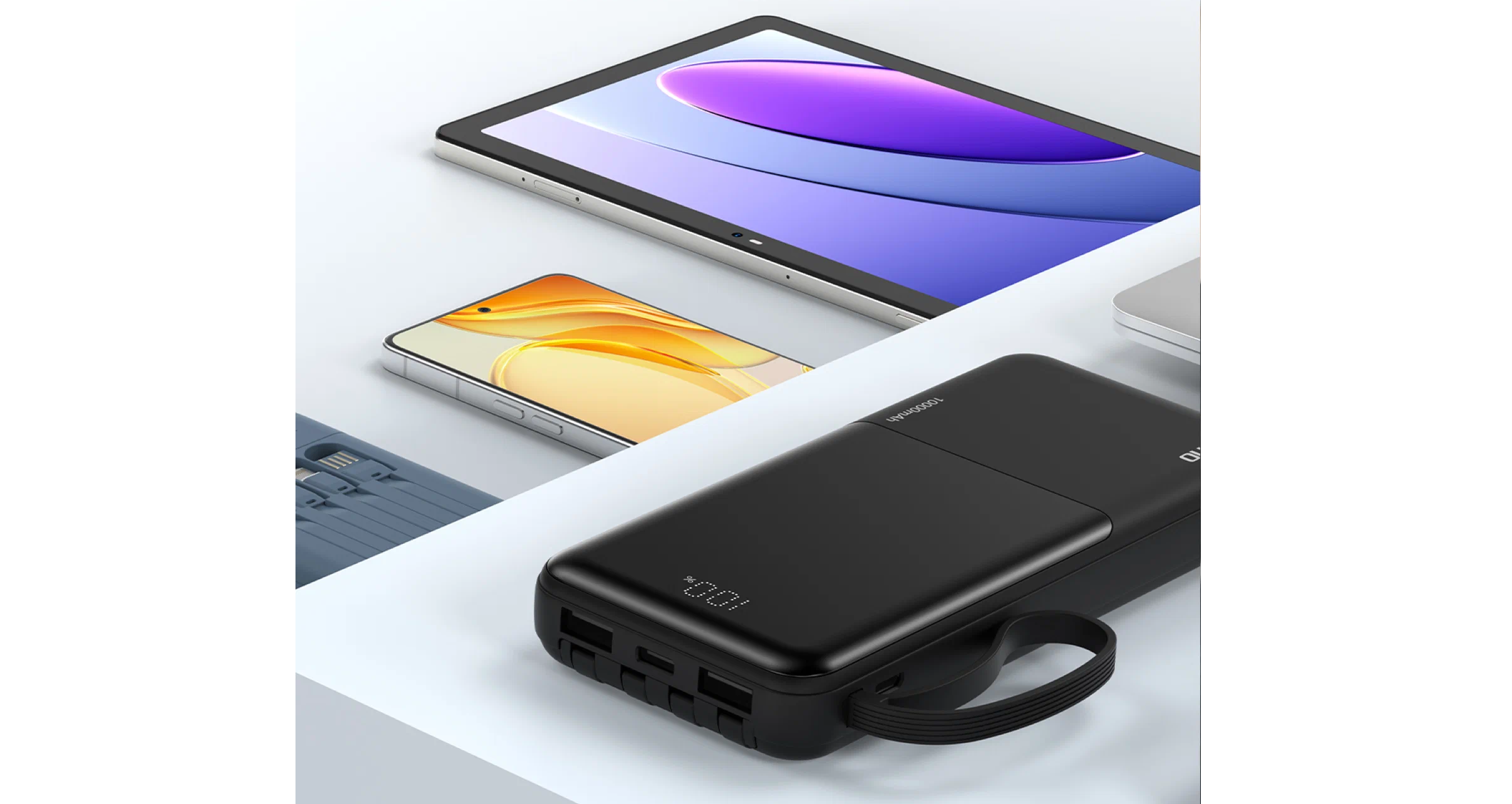 На корпусе предусмотрена кнопка проверки уровня заряда и LED-индикатор, который отображает оставшуюся ёмкость. Отсутствие дисплея делает конструкцию более простой и надёжной, без лишних элементов. Встроенная подставка особенно полезна при просмотре видео и видеозвонках, а силиконовый ремешок повышает удобство переноски.