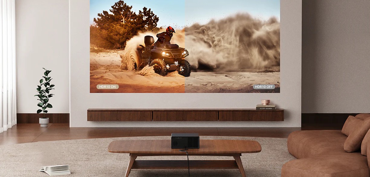 Проектор использует технологию LCD и LED-лампу с мощностью 130 Вт, обеспечивая яркость около 1100 ANSI люмен. Разрешение Full HD (1920×1080) с поддержкой 4K-контента, автофокус и автоматическая коррекция keystone позволяют добиться чёткого изображения без сложной настройки.