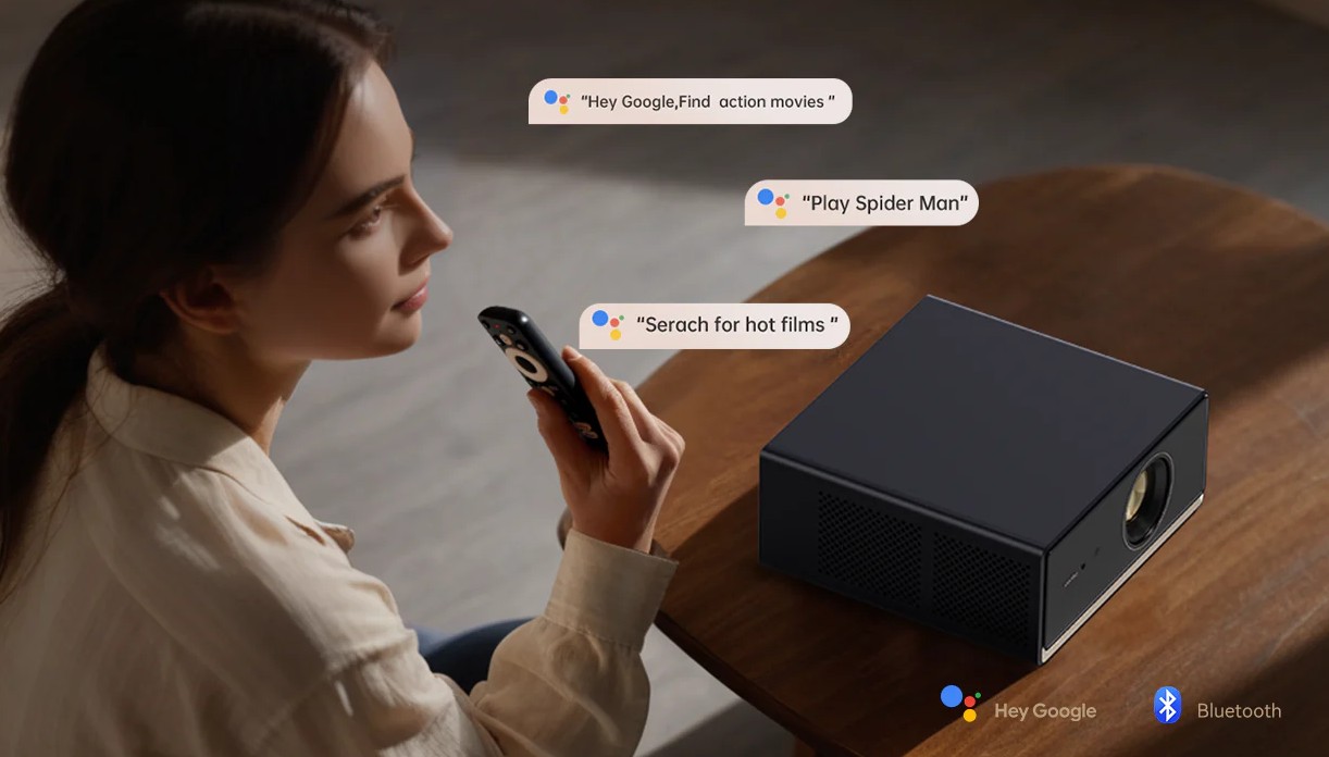 Проектор предлагает разнообразные входы и интерфейсы: HDMI, два USB порта, мини-джек 3,5 мм, Bluetooth, Wi-Fi. Управление через голосовой ассистент (Google Assistant) делает взаимодействие проще — можно открывать приложения, регулировать громкость, запускать видео без физического взаимодействия.