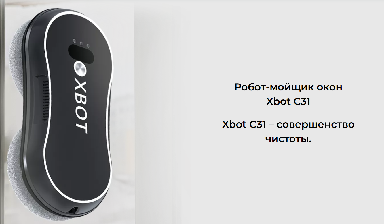 Xbot C31 выполнен в черном корпусе с серыми элементами и выглядит строго и современно. Компактная конструкция позволяет устройству уверенно перемещаться по стеклу, а небольшой вес делает его удобным в повседневном использовании и хранении.