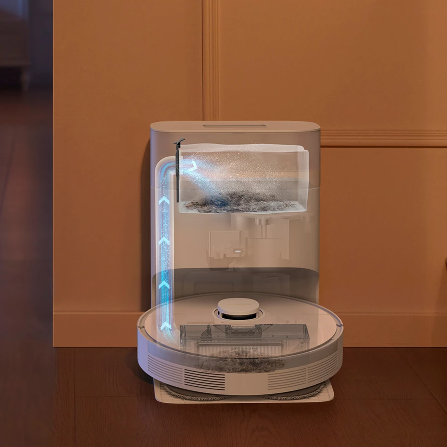 База DREAME L10s Plus служит не только для зарядки робота, но выполняет и другие функции. Основная из них — самоочистка. После окончания уборки или заполнения пылесборника робот автоматически выгружает собранный мусор в текстильный пакет, установленный на станции. Его емкости достаточно до 90 ежедневных уборок, в течение которых владельцу не придется заниматься обслуживанием прибора. Кроме того, база оснащена контейнером для воды и системой для очистки и сушки насадок швабр.