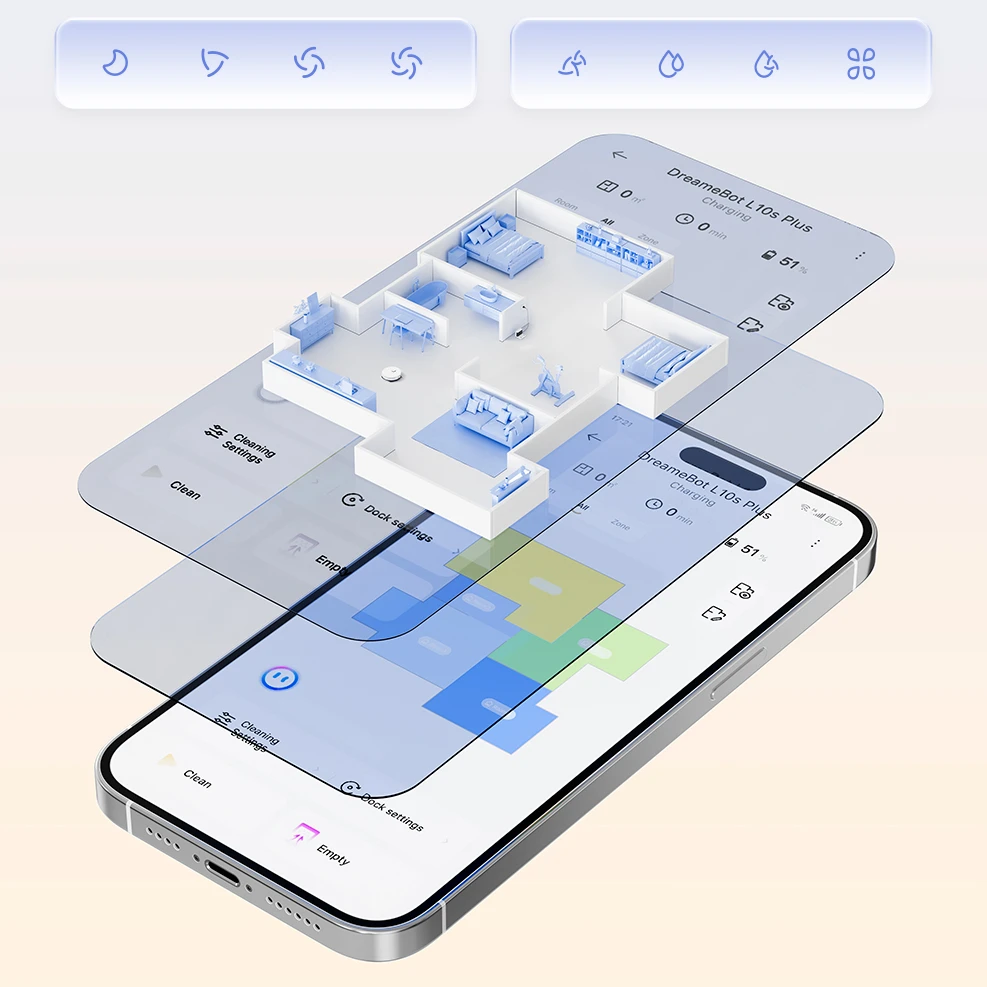 Для установки режимов уборки, ее очередности и других параметров, выставления виртуальных стен и запретных зон, а также других настроек необходимо приложение Dreamehome. Кроме того, с его помощью легко настроить параметры уборки на разных этажах многоэтажного дома. Также робот можно подключить к системе Умный дом и управлять им, отдавая команды голосовому помощнику.