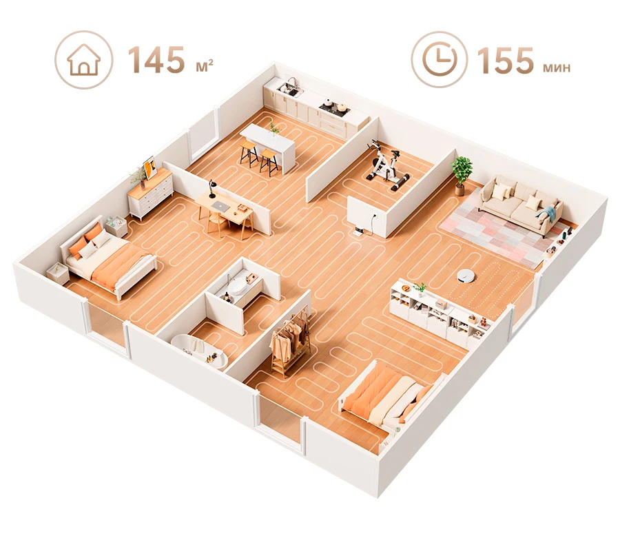 Емкость аккумулятора пылесоса составляет 5200 мАч. Этого достаточно для работы прибора в течение 155 минут и очистки помещения площадью до 145 м². Если в процессе работы батарея прибора сядет, он вернется на док-станцию, чтобы пополнить заряд, а затем продолжит убирать там, где остановится.