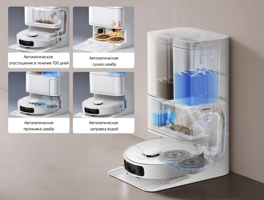 | Другие функции и возможности | голосовое управление, автоматический подъем мопов, выдвижение мопов для влажной уборки |