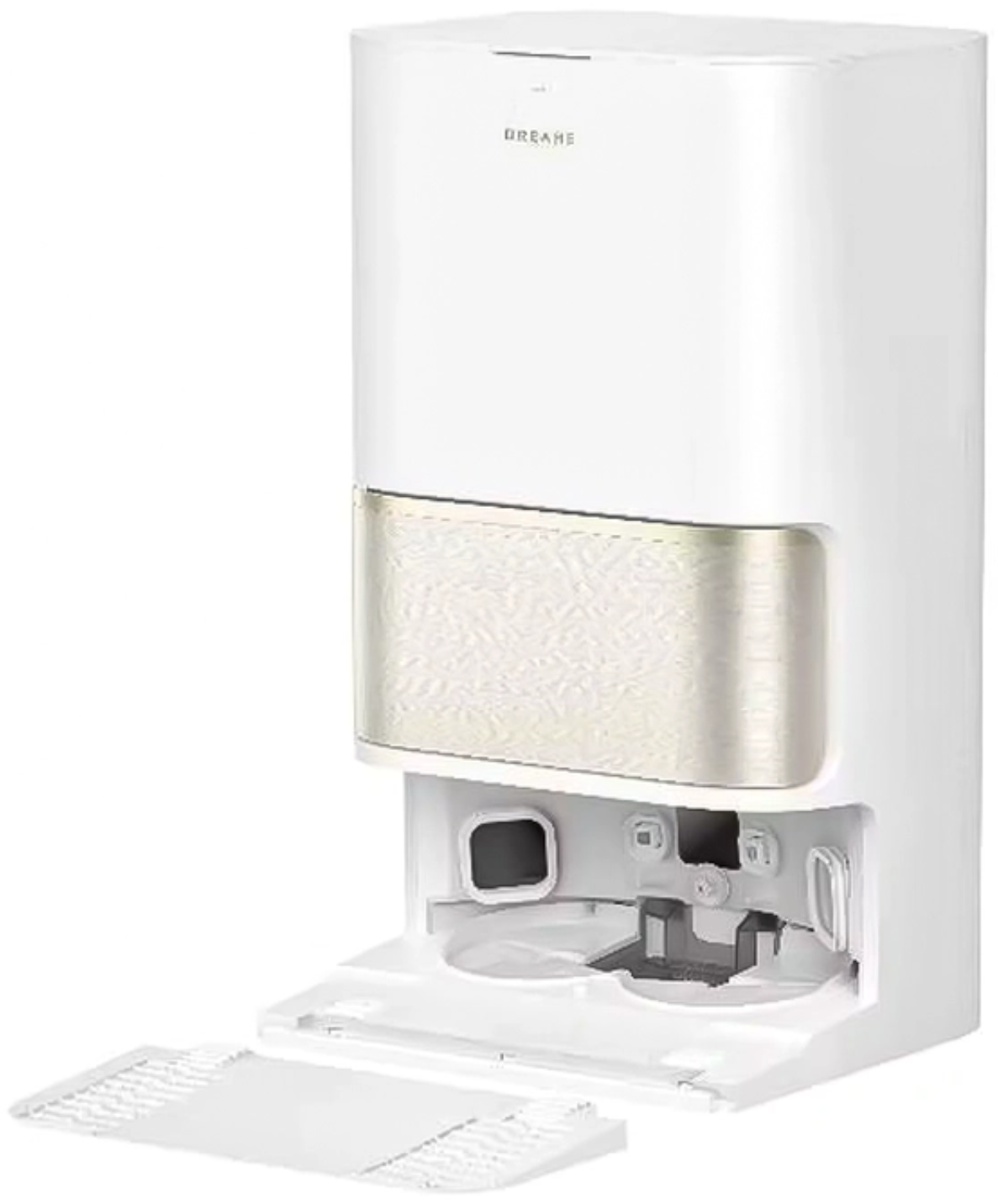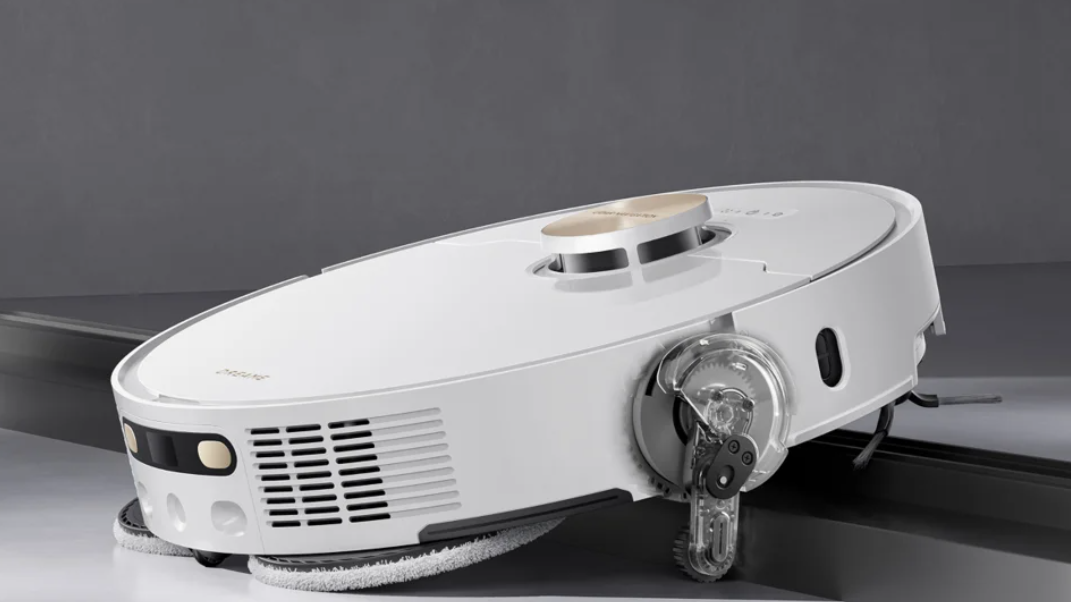 Dreame L50 Ultra CE сочетает мощную сухую и влажную уборку с интеллектуальной навигацией. Белый корпус с золотистыми акцентами подчеркивает премиальный стиль устройства.