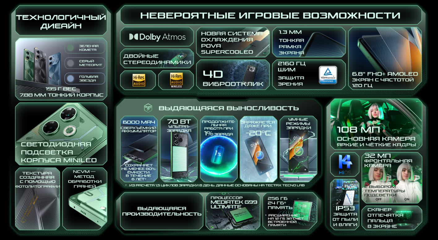 Непревзойденная выносливость POVA 6 позволит интенсивно пользоваться смартфоном в течение всего дня.
