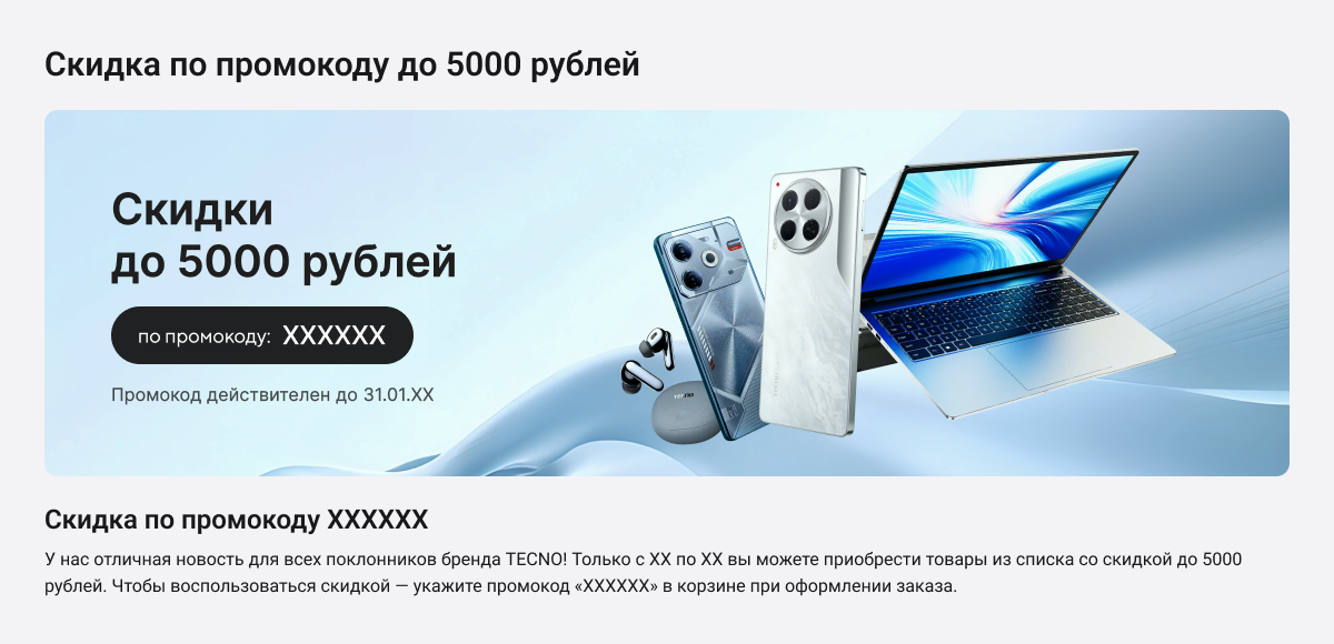 Промокод — это уникальная комбинация из букв и/или цифр, которая позволяет получить дополнительную скидку на определенный товар, услугу или весь заказ. Чтобы применить промокод, введите его при оформлении заказа на сайте в специальном поле.